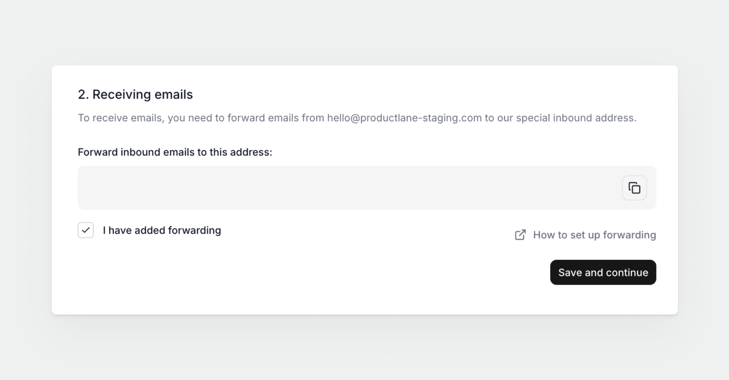 To receive emails, you need to forward emails from your primary email to our special inbound address. Check the box for I have added forwarding and press Save and continue. How to set up email forwarding