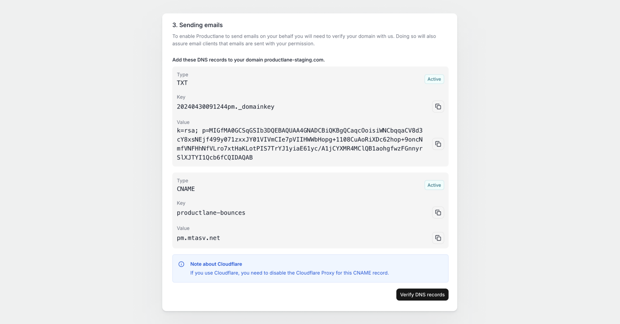 To enable Productlane to send emails on your behalf you will need to verify your domain with us. Doing so will also assure email clients that emails are sent with your permission. After adding the DNS records to your domain, press Verify DNS records.