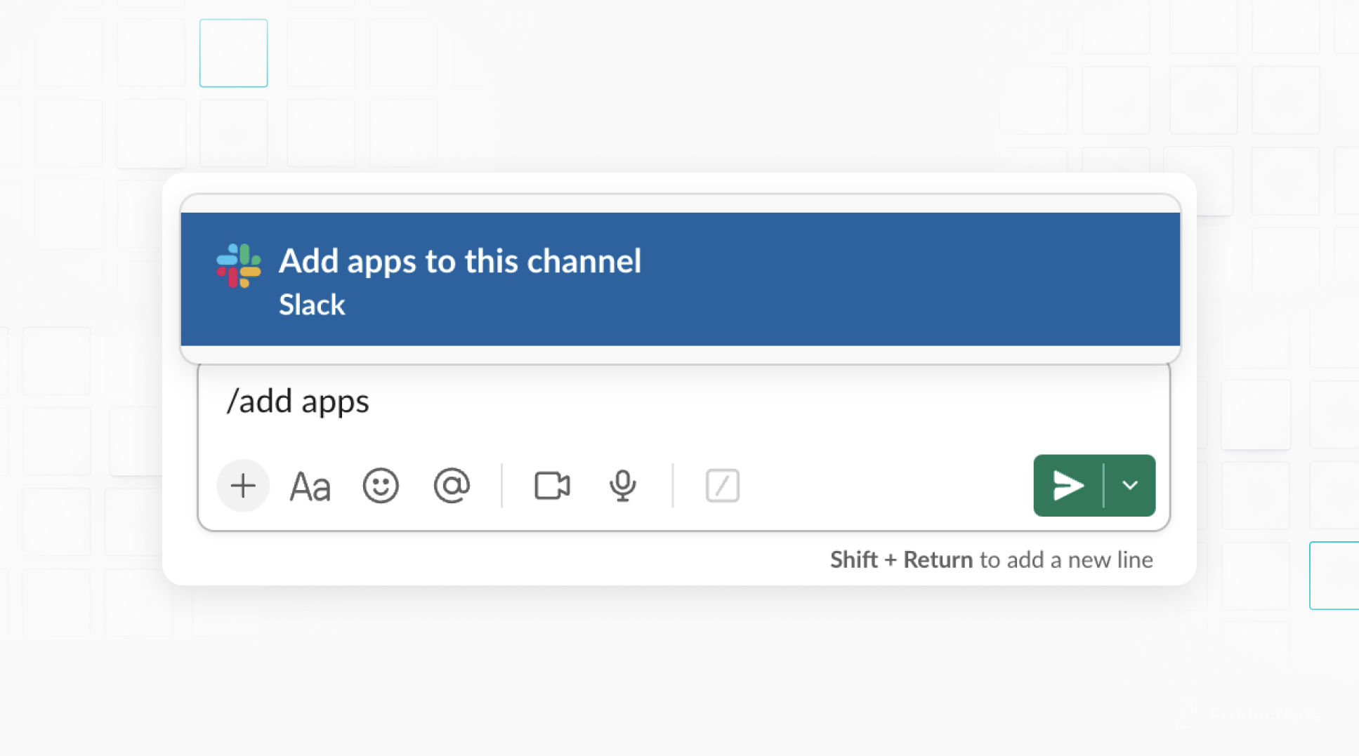 Open Slack and type “/add app” in a channel, and select the Productlane bot.